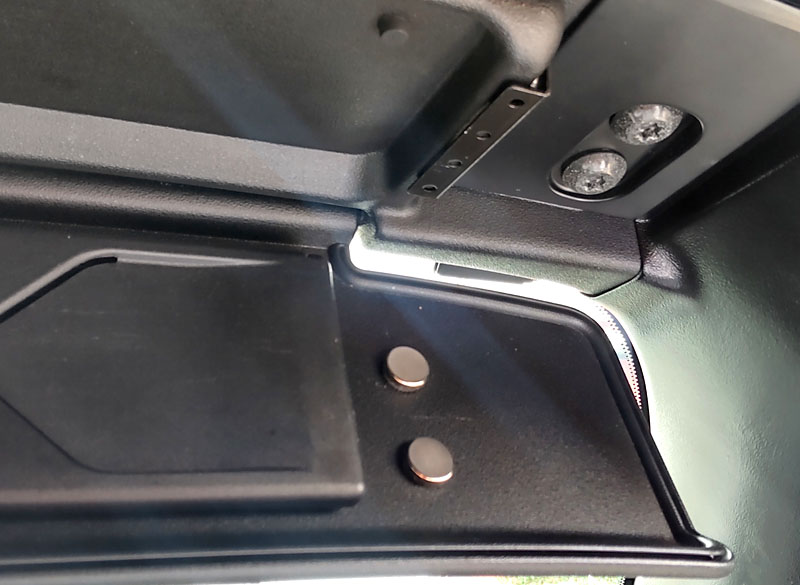 屋根側にL字アングル、バイザー側にネオジム磁石を内装用両面テープで貼り付けたところ、しっかり閉じられるようになった