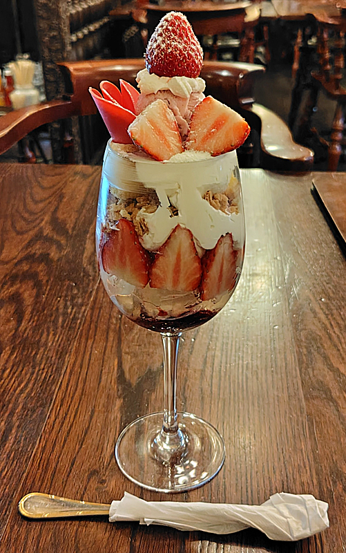 グラスの上半分はほぼバニラアイスとチョコアイス、いちご要素グラスに貼り付けられた