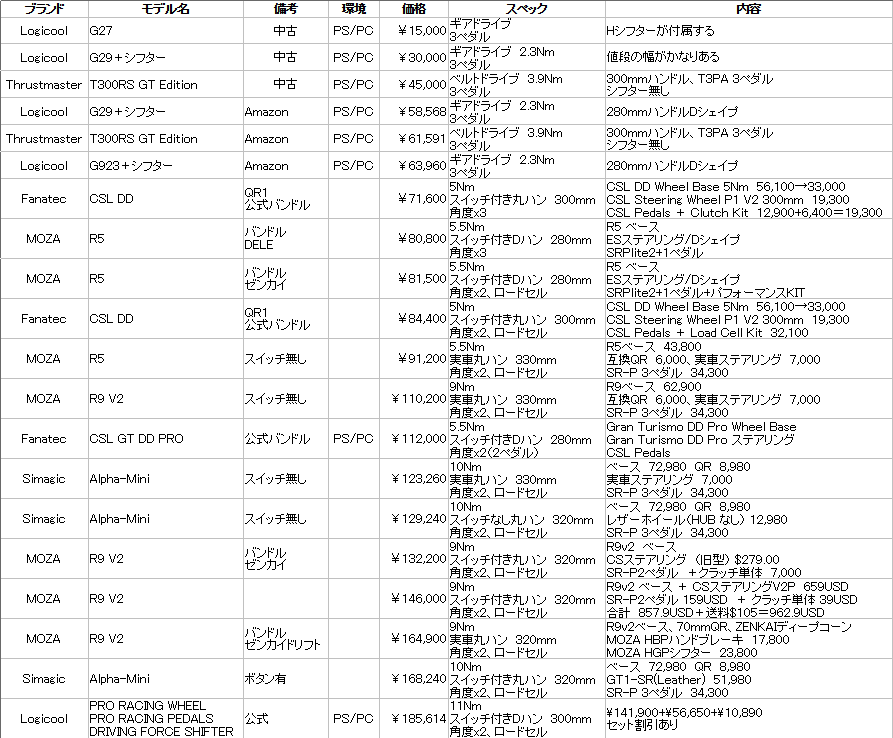 入門向けと、一般向けとしてはLogitech(Logicool)やThrustmaster等からセットで数万円程度で販売されているものがあげられる