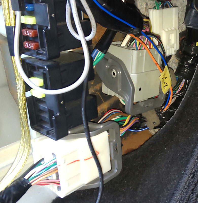 助手席側足元にあるヒューズボックスの下、大きなカプラーからリバース信号を分岐させる
